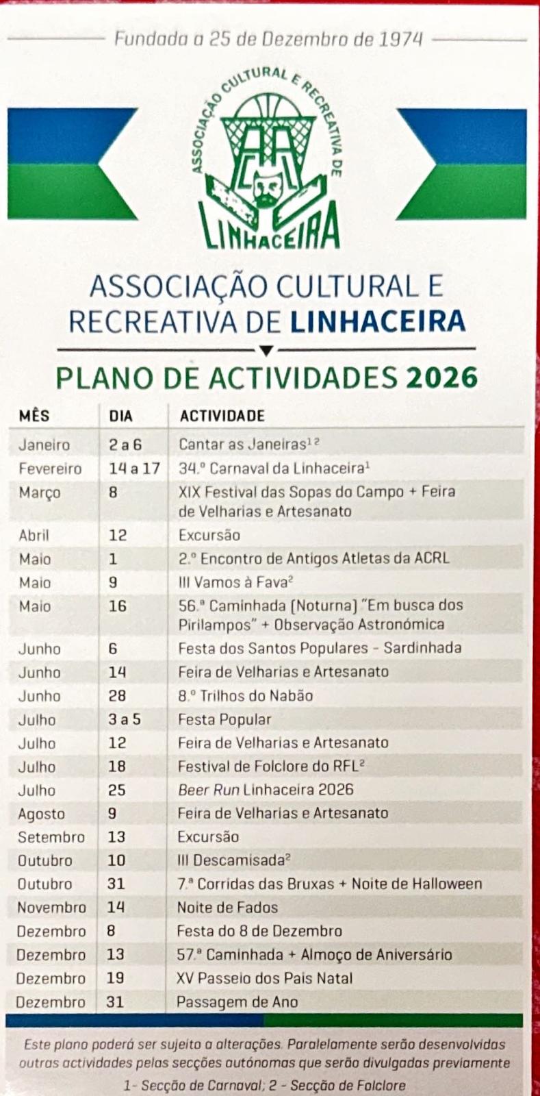 Para o Ano em vigor Embora o nosso desejo seja cumprir este plano de Actividades predefenido, poderão surgir alguns imprevistos. Assim como, outros eventos serão organizados que neste momento não estão aqui agendados. Por favor contatar a nossa Direção antecipadamente para confirmar todos os Eventos.